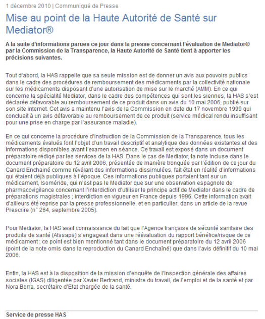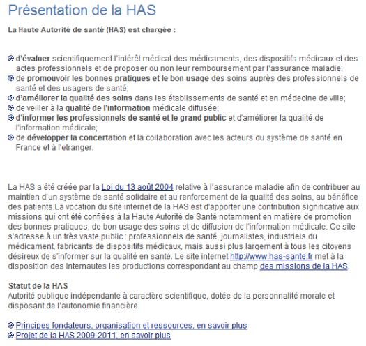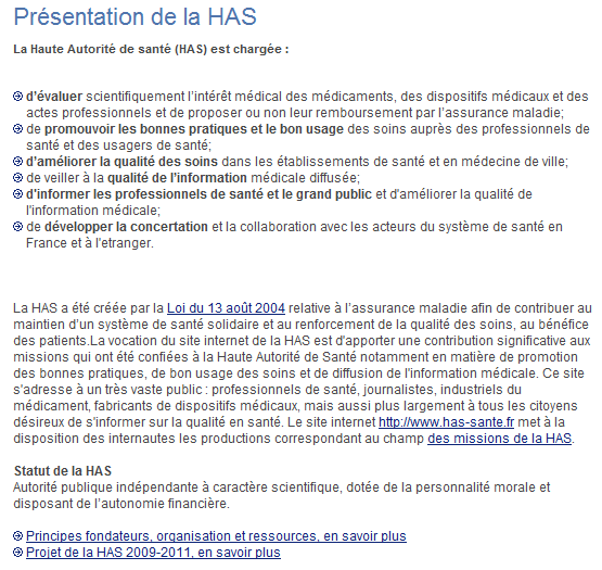Il était tellement urgent de répondre à l’attaque du Canard Enchaîné en se défaussant assez peu élégamment sur l’Afssaps, (qui a d’ailleurs mis à jour aujourd’hui sa chapelle expiatoire) que les rédacteurs de ce texte en ont oublié 5 des 6 missions pourtant attribuées à la HAS: