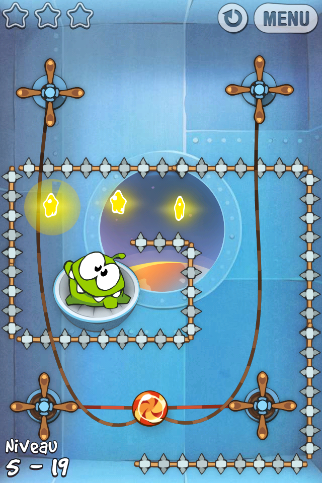 Le but est d’amener la friandise dans la bouche de la petite bestiole verte (OmNom de son petit nom) en coupant les bonnes cordes et en utilisant différents accessoires. Excellent petit jeux, mes enfants en sont fous. S’il ne devait en avoir qu’un…