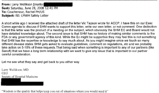 Dans cette histoire pas reluisante du tout, ni pour Sanofi, ni pour ceux qui ont essayé d’influencer la FDA, j’ai beaucoup apprécié ce passage d’un message électronique adressé par une cadre de Sanofi à un responsable d’une des deux sociétés savantes (p 93 du PDF):