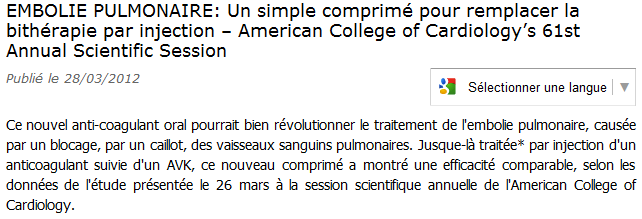 EINSTEIN-PE (NCT00439777) est un énorme travail (4832 patients!) randomisé, multicentrique (263 centres, 38 pays), ouvert qui a comparé un traitement standard par HBPM et Coumadine à un traitement par rivaroxaban (Xarelto®) chez des patients ayant présenté une embolie pulmonaire aiguë. La publication de ce papier a été un temps fort de l’ACC 2012 qui s’est déroulée à Chicago.