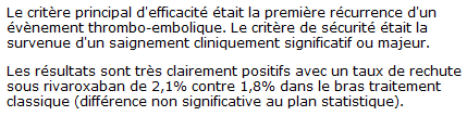 Le nombre d’évènements thrombo-emboliques suspecté a été plus important dans le groupe rivaroxaban (491/453), mais le nombre d’évènements confirmés a été identique (10.2%/9.7%).