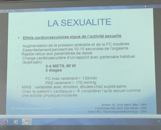 Sujet capital pour les patients. Comme toujours dans les cas complexes, le bon sens prévaut. Un des messages à faire passer aux patients: l’activité sexuelle est une activité physique comme une autre. Un sédentaire qui n’a aucune activité physique ne peut que favoriser une situation d’échec.