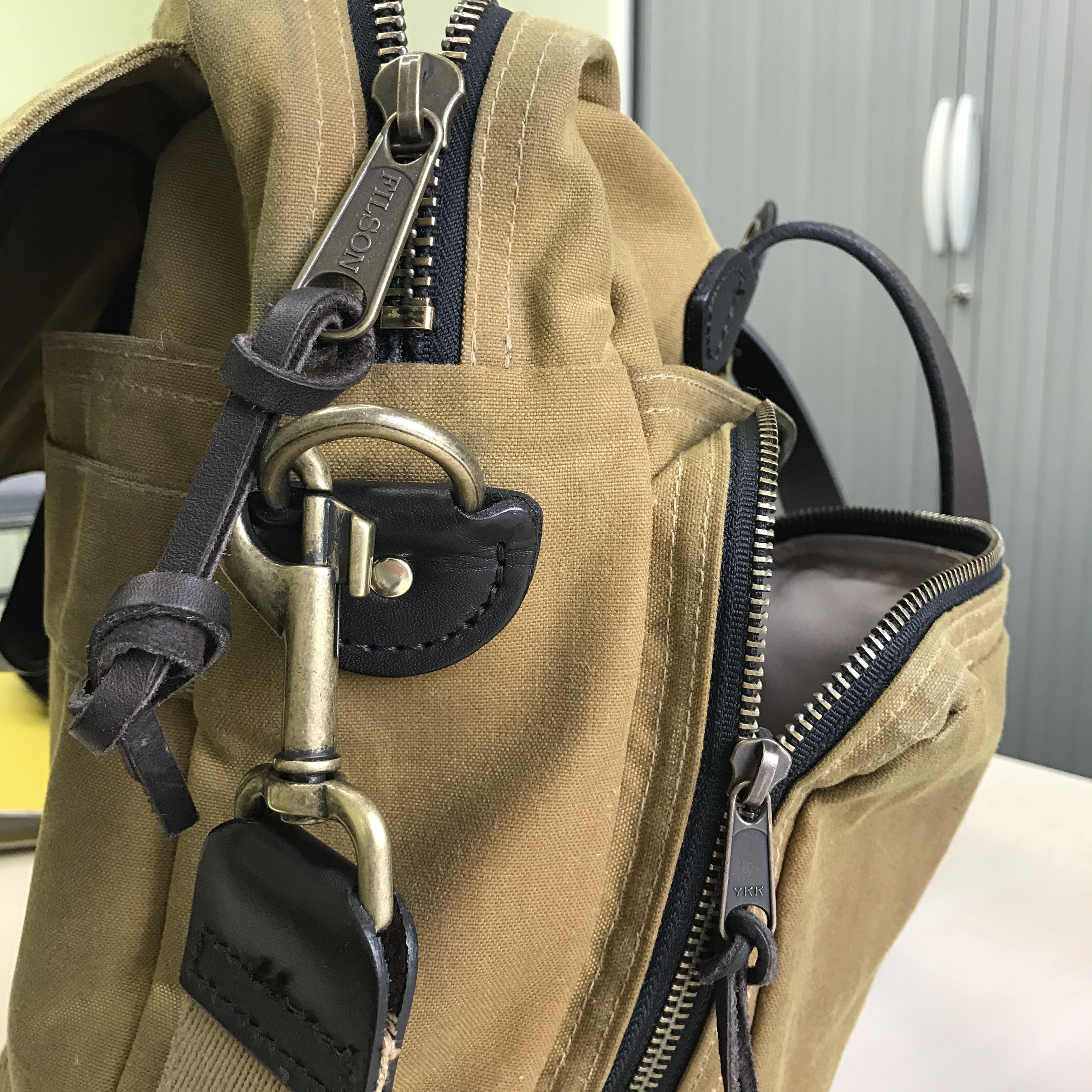 Les finitions extérieures sont techniquement parfaites et solides comme le roc (comme tous les produits Filson, paraît-il), mais nettement plus frustres. Peu de cuir, laiton non poli, bandoulière en coton brut.