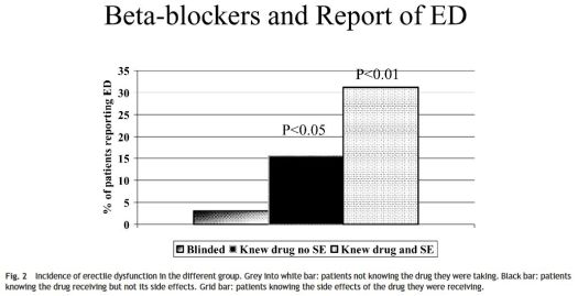 La colonne de gauche représente le pourcentage d’hommes présentant des dysfonctionnements érectiles sous beta-bloquant, alors qu’ils ne savent pas qu’ils en prennent. Celle du milieu, le pourcentage lorsqu’ils savent qu’ils prennent des beta-bloquants, mais ne sont pas informés de cet effet secondaire (ils sont allé voir sur internet, ou ils ont lu la notice!) et la troisième colonne, le pourcentage chez les patients totalement informés.