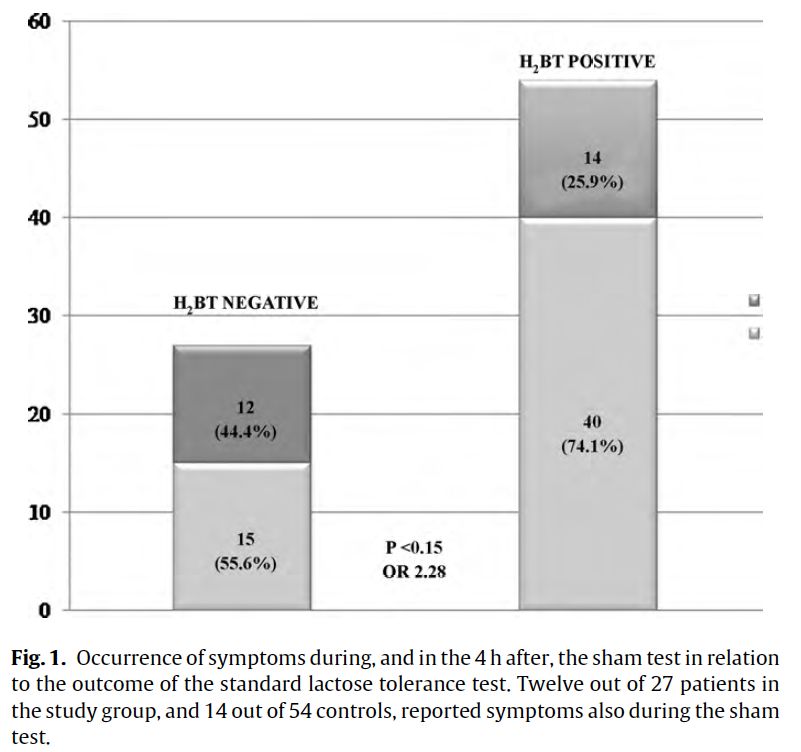 Des auteurs se sont intéressés à l’intolérance au lactose chez des patients présentant des symptômes abdominaux généraux. 44,4% des patients négatifs au test de dépistage de l’intolérance au lactose ont pourtant présenté des symptômes abdominaux induits lors d’un test utilisant un placebo du lactose, le glucose. 25,9% des patients réellement intolérants au lactose ont été positifs à ce « faux test ».