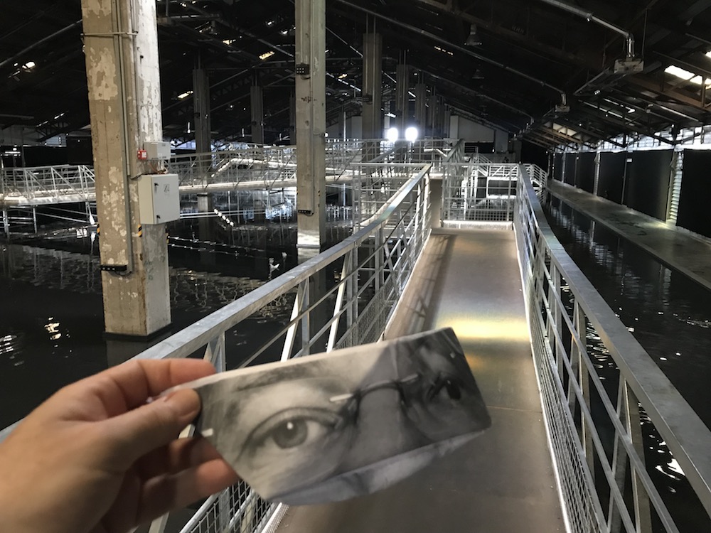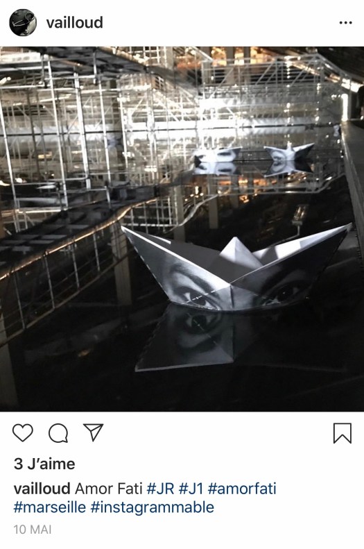 Cette viste m’a aussi permis de découvrir le J1 qui est laissé dans son jus de friche industrielle (je pense notamment au double tourniquet noir qui sert d’entrée et qui est fort peu engageant). L’installation est un immense bassin noir où le visiteur regarde naviguer un bateau en papier dont la coque est ornée de son regard. Pour 7€, j’ai pu faire naviguer mon bateau faire partie d’une oeuvre de JR (et regardé un court-métrage avec Bob de Niro, visible ici pour 0€). Je soupçonne un peu JR d’avoir rattaché artificiellement son oeuvre avec la tragédie des migrants pour complaire aux bobos en quête de compassion facile. Je me suis contemplé dans cette oeuvre, qui contrairement à ce qu’en a dit JR est très instagrammable (qu’instagrammable?) et je n’y ai rien vu.