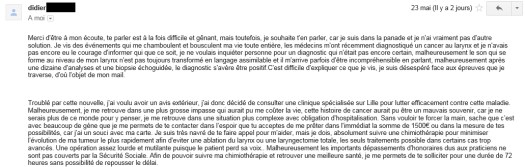 Malheureusement, il a un cancer du larynx et il ne peut pas payer les dépassements d’honoraires des médecins d’une clinique de Lille car sa carte bleue est bloquée. Si je lui avance 1500€, promis, il me les remboursera dans 72h.