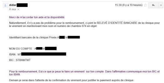 Sa boite mail est identique, à une lettre près. Par exemple didier.ddupont@orange.fr contre didier.dupont@orange.fr. Je lui ai demandé à plusieurs reprises l’adresse exacte de la clinique afin que je puisse lui envoyer des bonbons (je fus un peu cynique), sans succès. Par contre, il m’a fait parvenir assez rapidement le RIB de « l’établissement », qui entre deux messages a changé de nom, et surprise, le compte est domicilié dans une banque maltaise.
