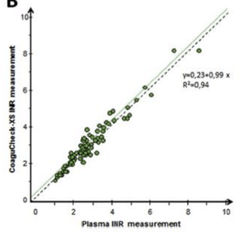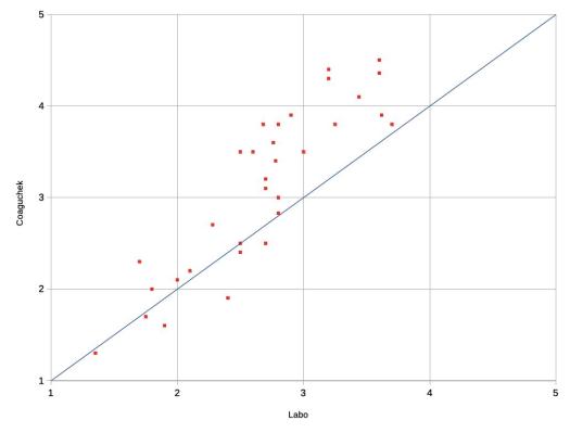 Seules 36,59% des doubles mesures montraient une discordance de moins de 15%. À vue de nez la corrélation est excellente à condition de de pas observer un INR supérieur à 2,5-3 sur Coaguchek.
