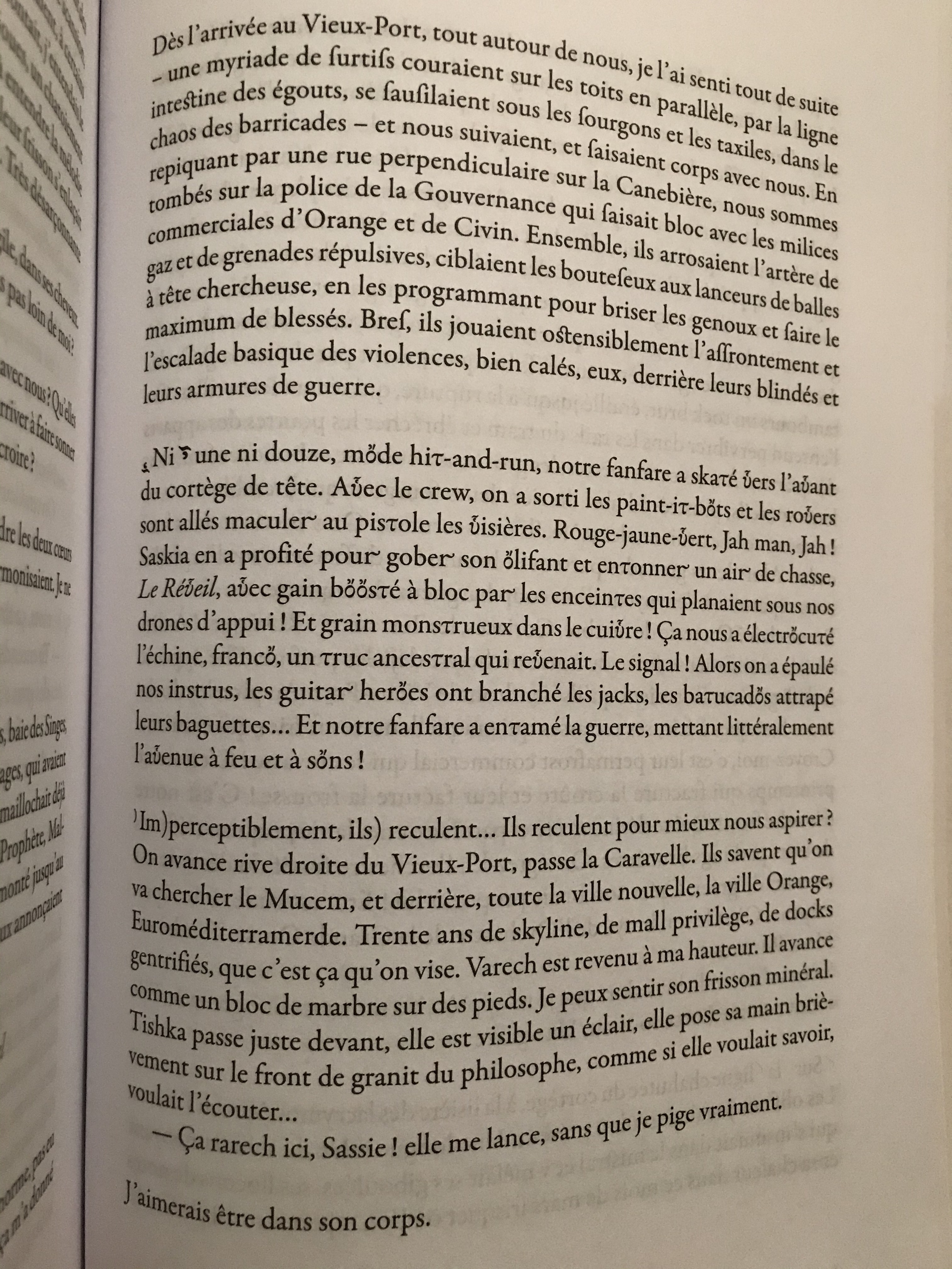 Par contre, autant La Horde était dénué de message politique et se situait dans un monde imaginaire, autant une des grandes qualité des Furtifs est de décrire notre monde dans quelques années. Damasio décrit une France dont l’Etat, dépassé aurait laissé l’essentiel du pouvoir à de grandes sociétés privées, par exemple Orange qui a « racheté » la ville d’Orange ou Civin (Vinci de façon assez transparente) a racheté une partie de Porquerolles. Ces sociétés fondent leurs bénéfices sur la privatisation de l’espace public, et sa répartition en zones plus ou moins agréables à vivre en fonction du forfait souscrit. Chaque être humain est devenu une mine de données exploitées par ces grandes sociétés, ce qui implique un contrôle permanent actif et passif sur l’individu. Le monde décrit est d’autant plus effrayant qu’il me semble parfaitement plausible et que l’action se passe dans le sud de la France avec des sociétés existantes. Tout est un peu trop manichéen, et Damasio tombe parfois dans la facilité, mais j’ai adoré cette facette du récit. Je me suis pris à vouloir participer à une ZAD, ça n’a duré qu’une fraction de seconde, mais c’est dire comme Damasio est entraînant quand il parle de lutte. Il néglige un peu la pollution qui risque de nous tuer avant que Orange rachète Orange, dommage, ça aurait pu ajouter un peu de piquant chimique à l’histoire.