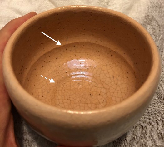 La flèche pleine délimite deux zones: le chasen en dessous, dans cet exemple il est vernis, et le chakin au dessus. Un chasen est aussi un petit fouet de bambou utilisé lors de la cérémonie du thé pour battre la poudre de thé (matcha). On comprend mieux le vernis qui protège la poterie. Le chakin est le linge utilisé pour sécher le bol. Vous imaginez bien le petit mouvement circulaire réalisé avec le tissu entre le pouce et l’index.
