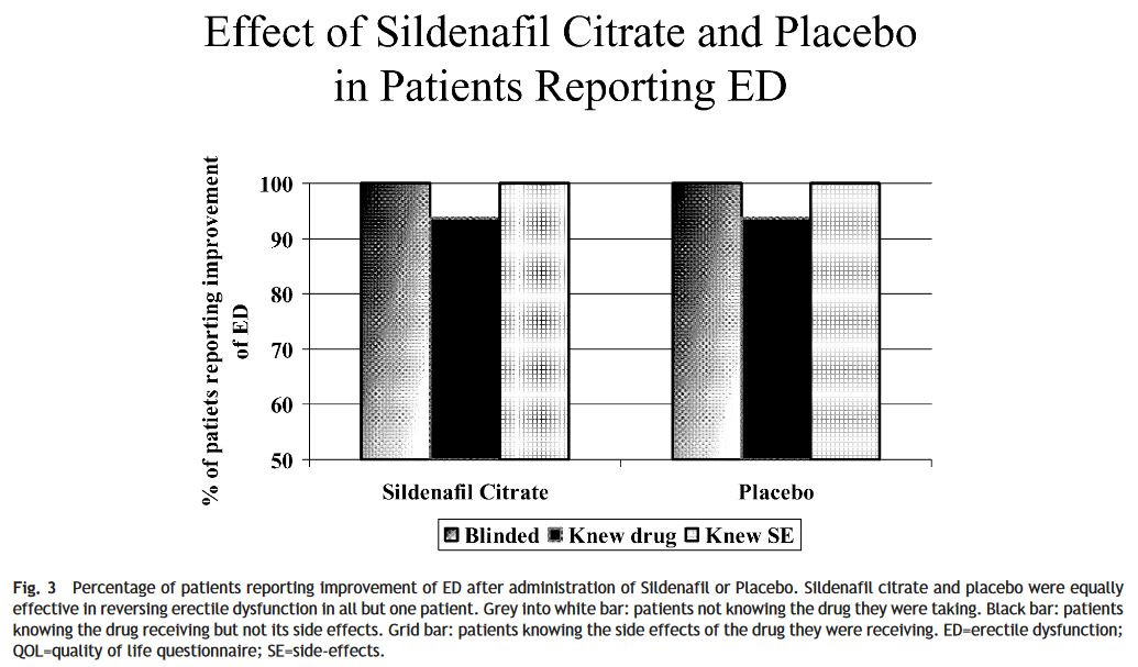 On donne à 3 groupes d’hommes cardiaques, sans dysfonction érectile des beta-bloquants. Groupe 1: ils ne savent pas ce qu’ils prennent, groupe 2: ils savent que ce sont des beta-bloquants, mais on ne leur a pas parlé des effets secondaires, groupe 3, ils savent ce qu’ils prennent, et connaissent les effets secondaires, notamment la dysfonction érectile.