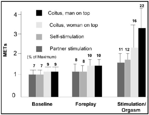 En fait, assez peu, puisque une activité sexuelle « moyenne » entraine une dépense énergétique comprise entre 2.5-3.3 MET. Ce qui correspond environ à monter 2 étages ou faire du vélo à un palier de 60W.