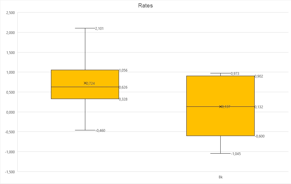 On peut aussi représenter ces mesures selon un graphique joliment appelé boite à moustache (Box-plot en anglais). On retrouve notre moyenne à 0.662 (j’ai arrondi à 0.7), une médiane à 0.609… Je ne rentre pas plus dans les détails.