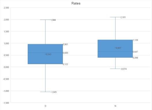 L’intérêt de la boite à moustache est de pouvoir comparer deux populations, ici deux types de mesures, par exemple de jour (Day) et de nuit (Night):