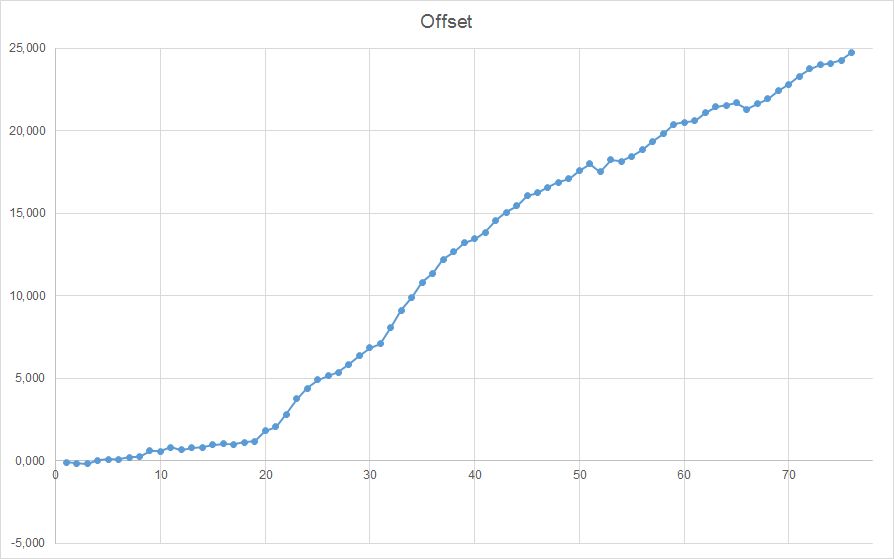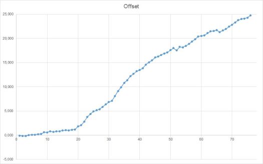 Enfin pour terminer, deux petites analyses graphiques. D’abord l’erreur cumulée en fonction du temps (Offset):