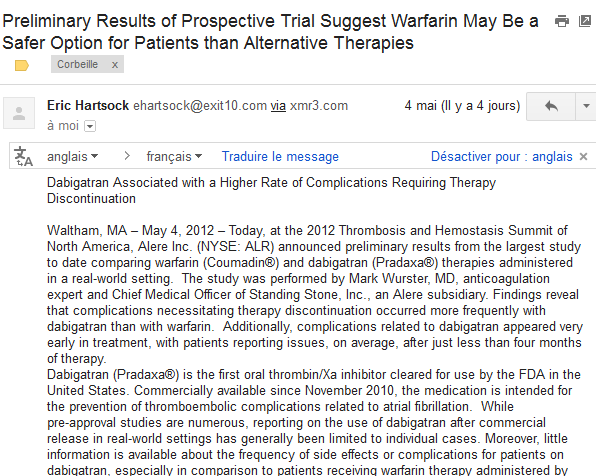 Je me suis intéressé à Sanofi, comme bruit de fond (Mouhahahahaha), et les autres car les trois nouveaux anticoagulants cités sont la grande nouveauté des recommandations 2012.