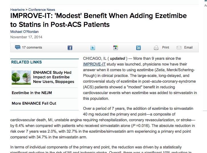 Pas de précipitation, je ne pense pas qu’il soit totalement déraisonnable de savoir résister aux sirènes de « 20 ans d’innovation » en réfléchissant bien avant de prescrire de l’ezetimibe, même aux patients de la population étudiée par IMPROVE-IT.
